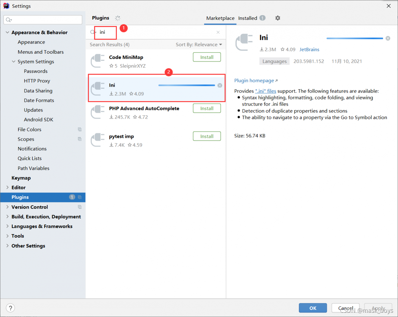 下载插件ini4idea,但是我没有找见,后面搜索ini就能看到了,然后点击下载,等待他下载。