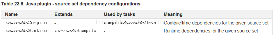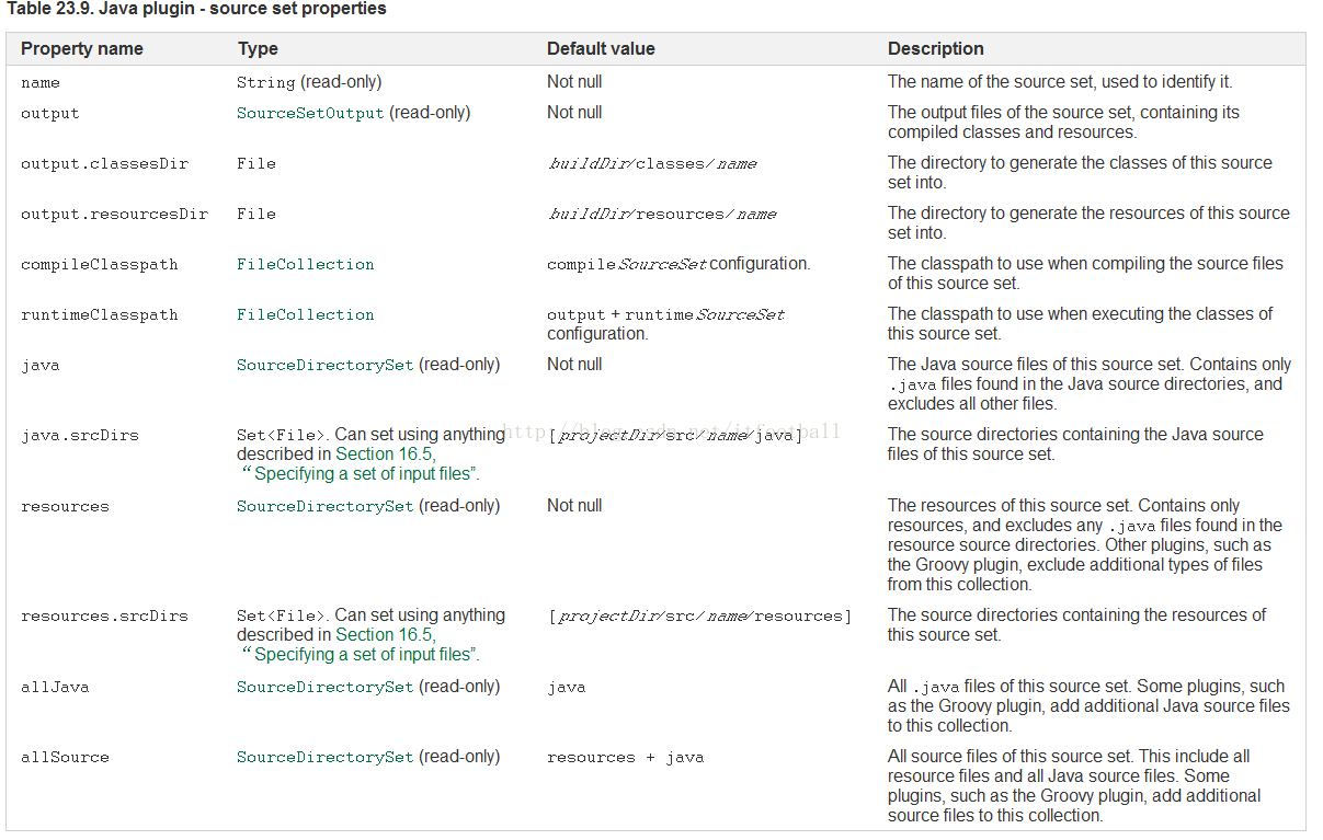 java插件引入了sourceset这个概念,sourceset将编译时和执行时所要用到的source文件组合在一起,其中包含java的源文件和资源文件,有的插件还包括了groovy和Scala资源文件,sourceset与编译环境和运行环境都存在联系。