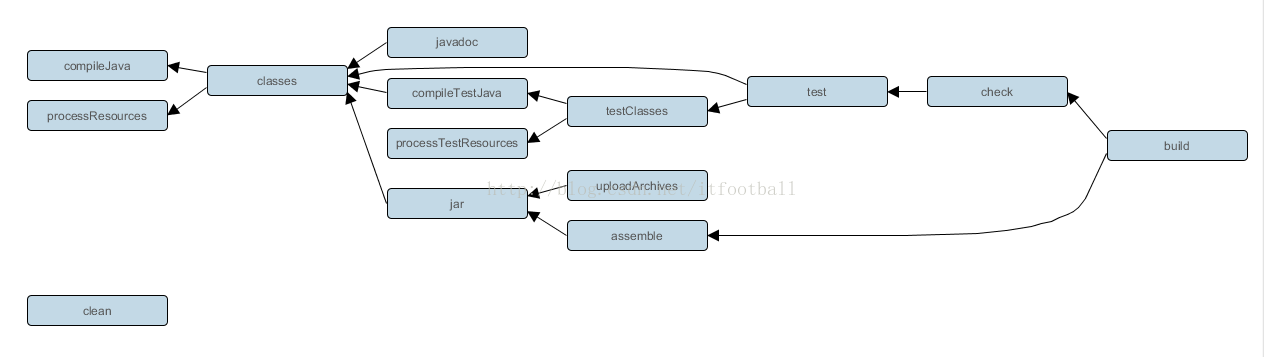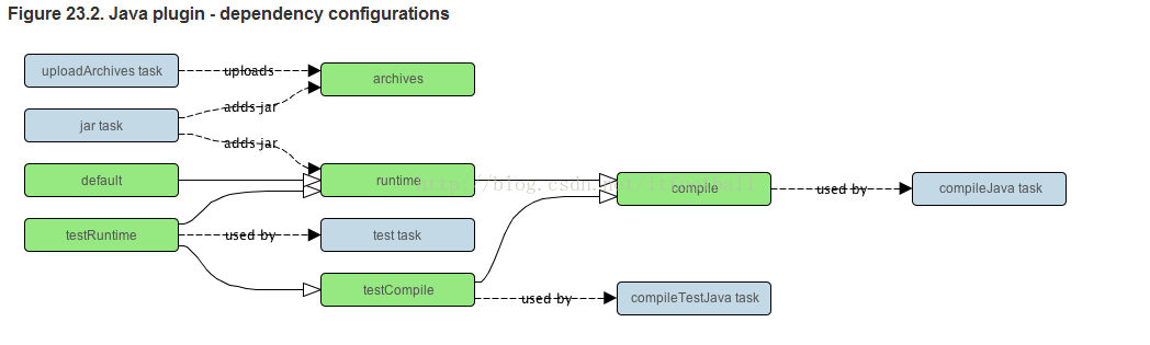 上面的图更加的清晰展现出java任务和gradle任务之间的联系,浅蓝色的代表java任务,绿色代表gradle任务。用used by标注的代表箭头指向的任务使用了左边的任务。