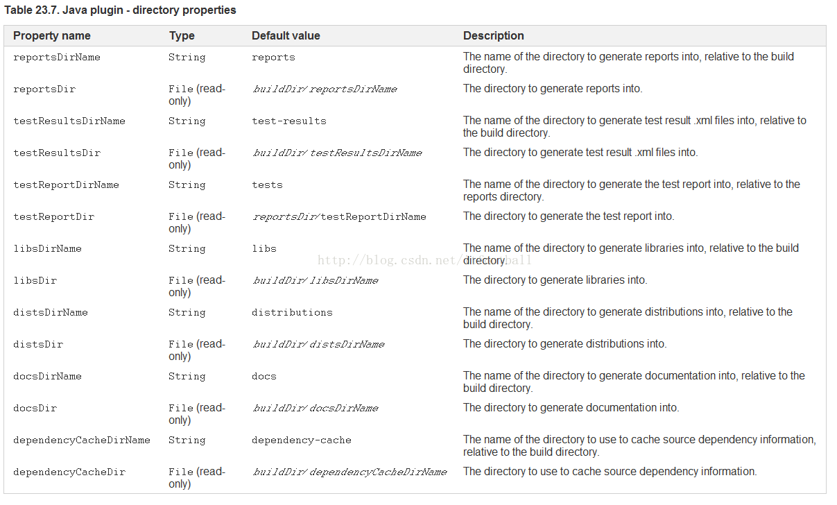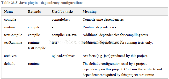 上面的图是从文档上截取下来的,它列举了任务之间的依赖关系,比如第一个compile是被compileJava所依赖的,即执行compile前,会先执行compile。所以要理解Name列是被依赖的任务,一般是全局任务,不是java插件特有的,而Used by tasks一般是plugin特有的。Extends则说明继承的任务,说明该任务是在被继承任务的基础上扩展的。