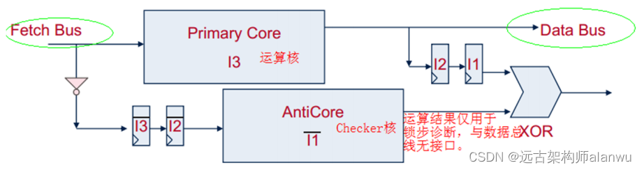 - 时间上,Primary Core先取指,运算结束后延时两个CPU clock时间,再传给Compare单元,Checker Core延时两个CPU clock时间后取指令,运算结束后传给Compare单元;