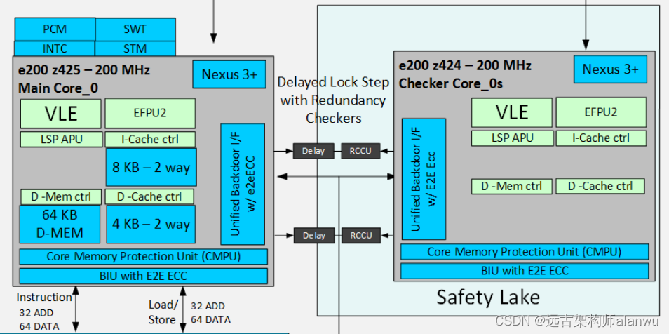 目前商用的双核锁步lockstep方案,基本上是周期精确的硬件对比为主,不过多修改软件程序正常进程,同时硬件保证数据对比结果正确性,并及时硬件纠错和程序回卷。同时,在芯片设计过程中,还需要对两个核的位置摆放和电源供电等有特殊要求。商用方案均采用delay周期的方式解决共模失效问题,同时checker内部可以上电自检一次,确保上电后checker硬件有效,内部需集成self test模块,该模块用于自测试和LBIST测试。
