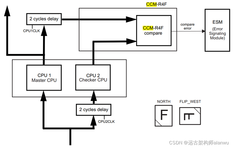 - 两个CPU在分别在运算之前和之后有两个周期的延时,从时间上避免了共模失效;