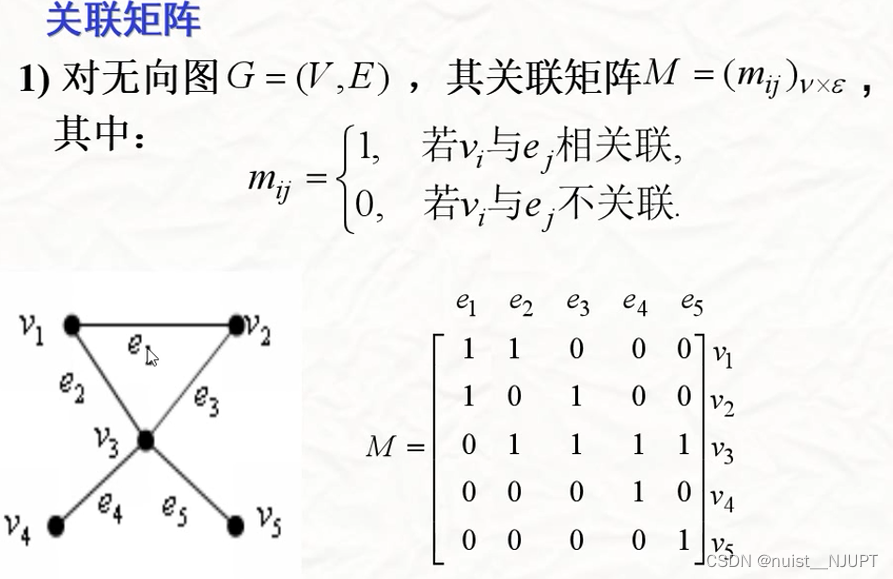 下面看一下无向图的关联矩阵的概念,就是顶点和边直接相连的,我们称之为关联,关联则矩阵中写1,反之,写0.