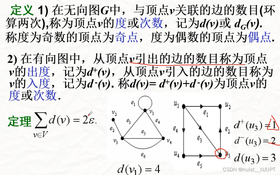 我们再看一下顶点中度的概念,对于无向图,与顶点关联的边的数目,就是直接相连的数目称为度。对于无向图而言,有入度和出度的概念,分别是引入顶点和从顶点引出的边的条数。总的度数目=2*总的边数目。
