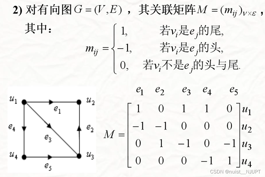 再看一下有向图的关联矩阵的概念,如果顶点和边直接关联,顶点是头则是-1,顶点是1是尾,否则是0.