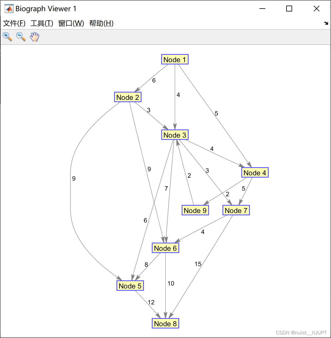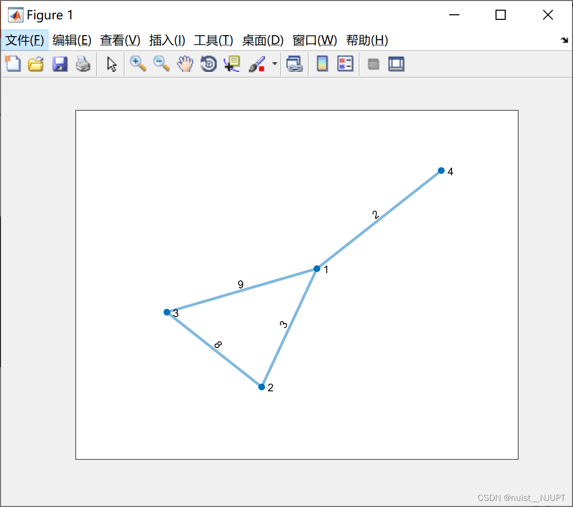 最小生成树算法主要是cruskal和prime,这里具体的理论不在赘述,需要看理论的自行百度即可,这里演示matlab工具箱实现生成最小生成树。