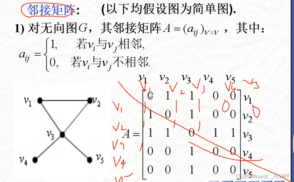 我们看一下邻接矩阵的概念,就是将图中的顶点是否连接用0和1表示,1表示连接,0表示未连接。无向图的邻接矩阵是对称的。