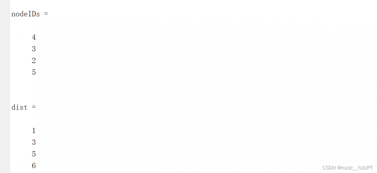 运行的结果如下,其中P表示最短路径,d表示最短路径的长度,D表示任意两点之间的最短路径距离,返回图形 G 中与节点 1 的距离在 8 之内的所有节点。nodeIDs是符合条件的节点,Dist是这些节点与1的距离.