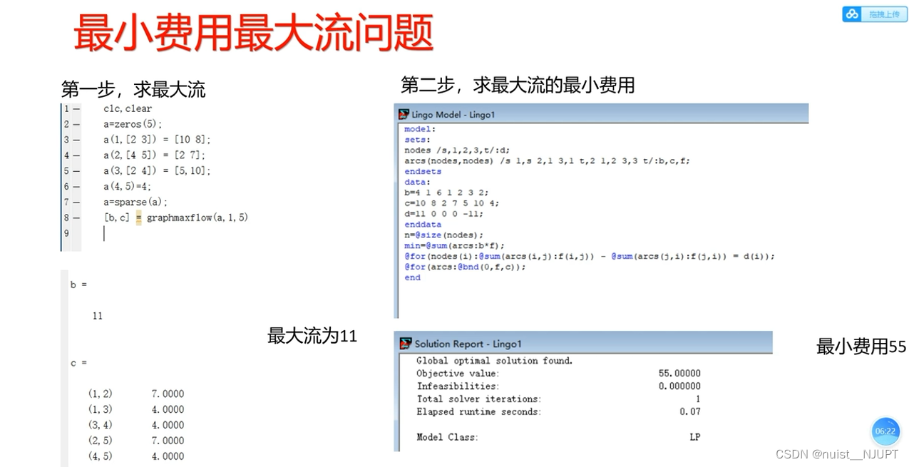 我们看下面的最小费用最大流的问题,我们使用matlab求解最大流,然后使用lingo求解最小费用,具体如下: