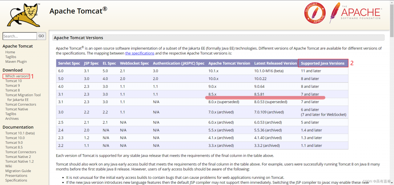 根据要求的java的最低版本来选择Tomcat 的版本,在此以8.5版本为例(企业应用较多)。