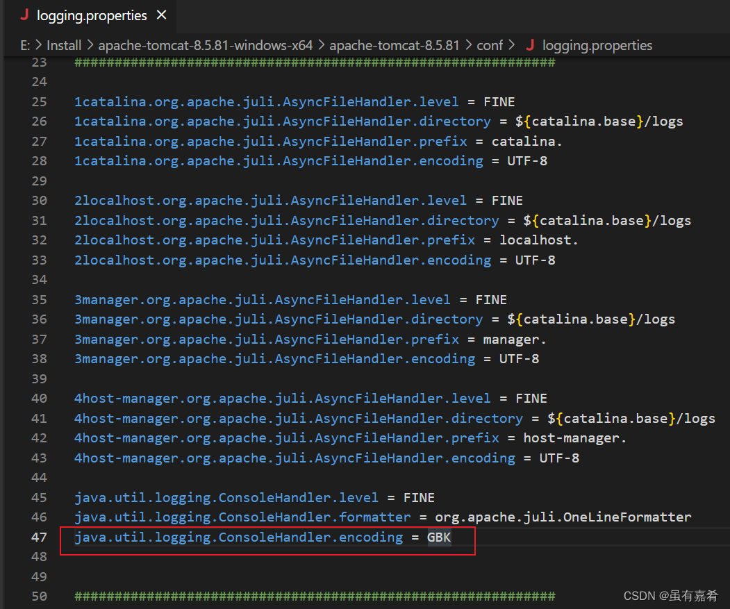 修改conf/logging.propertles(一般是注释上边最后一行,如果和我版本一样是在47行)