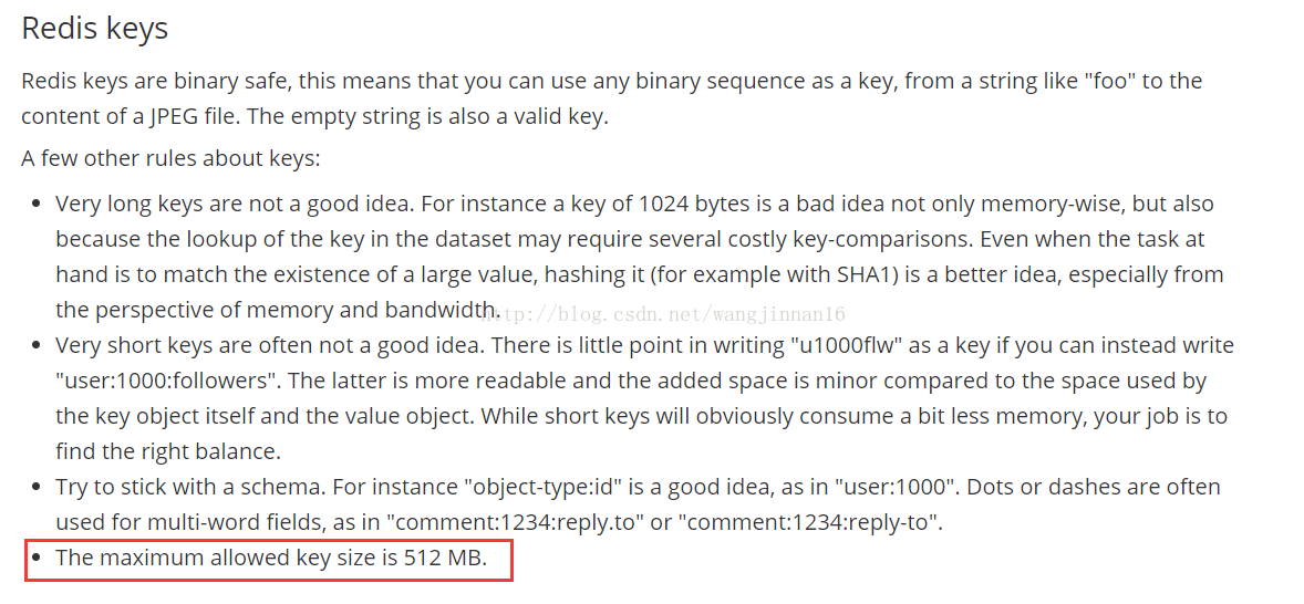 今天研究了下将java bean序列化到redis中存储起来,突然脑袋灵光一闪,对象大小会不会超过redis限制?不管怎么着,还是搞清楚一下比较好,所以就去问了下百度,果然没多少人关心这个问题,没找到比较合适的答案,所以决定还是去官网找吧。找到两句比较关键的话,截图如下。