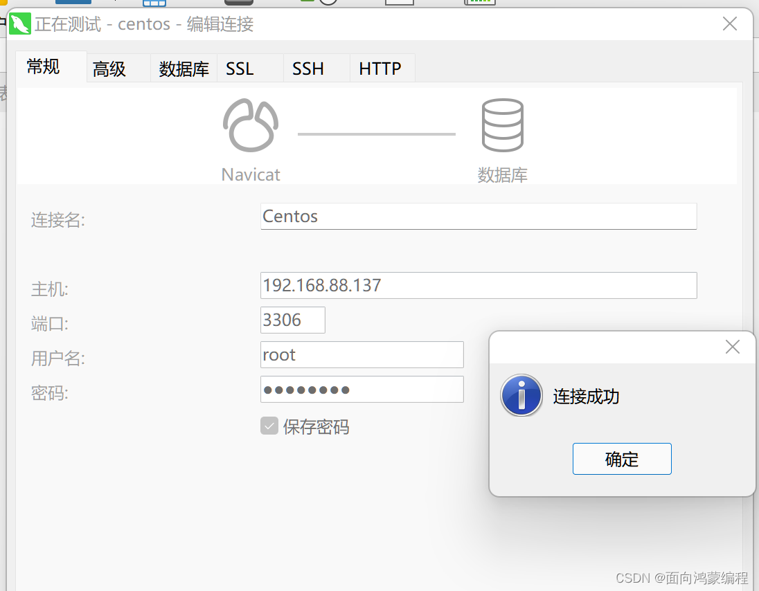 上面我们通过ps命令看到mysql容器已经跑起来了,但是我们需要进一步确认访问mysql数据库是否OK。我们可以打开navicat工具,执行如下操作!