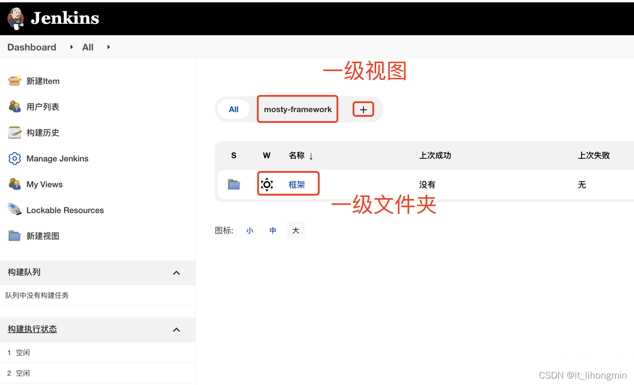 Jenkins允许将项目使用 视图(VIEW)或 文件夹以将所有要发布的项目进行隔离,如下: