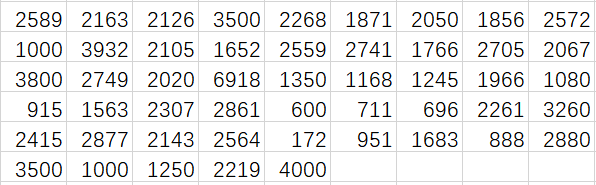 income=np.array([2589,2163,2126,3500,2268,1871,2050,1856,2572,1000,3932,2105,1652,2559,2741,1766,2705,2067,3800,2749,2020,6918,1350,1168,1245,1966,1080,915,1563,2307,2861,600,711,696,2261,3260,2219,2415,2877,2143,2564,172,951,1683,888,2880,4000,3500,1000,1250])