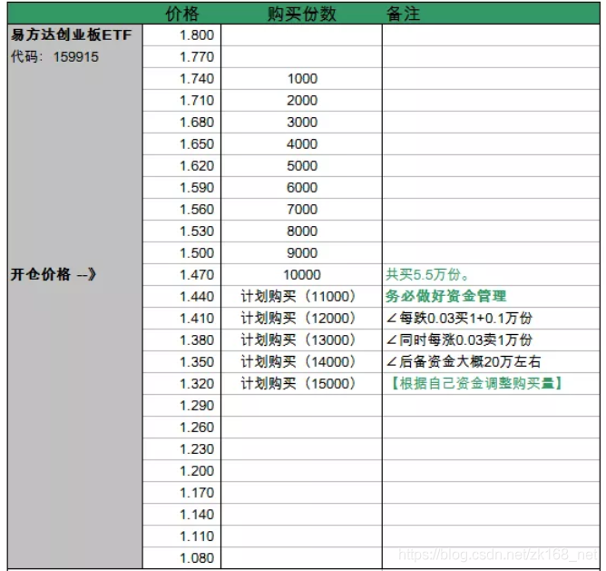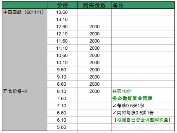 说明:1.47建底仓,每跌0.03,多买1000个份额。倒金字塔买进。(当然你也可以和中国国航一样,等份额买入,每次买入10000份。)
