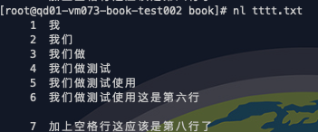 [root@1-min etc]# nl -ba tttt.txt //显示所有行号(包括空行)