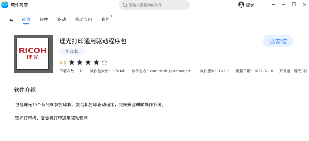 与此同时,理光打印机、复合机打印通用驱动程序包也已上架麒麟软件商店,包含理光19个系列80款打印机、复合机打印驱动程序,实现完美兼容。