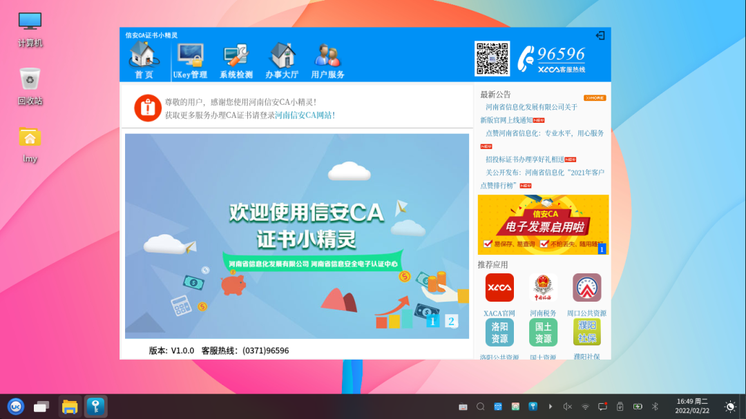 提供网信环境下的系统服务并提供证书展示、数据加解密、数字签名、数字信封制作、读取签章等功能,用户可依据自身需求进行二次开发。
