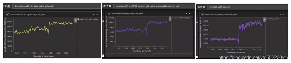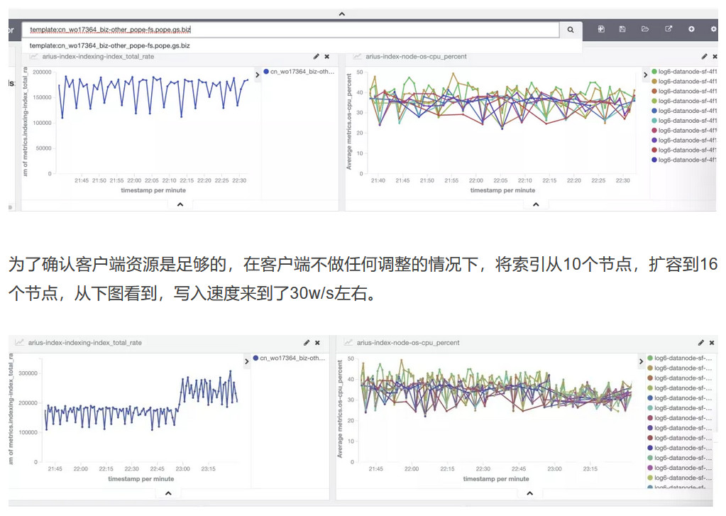 生产环境索引写入性能的提升比例跟索引混部情况、索引所在资源大小(长尾问题影响程度)等因素影响。从实际优化效果看,很多索引都能将写入速度翻倍,如下图所示: