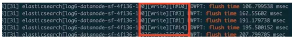 write线程是用来处理BulkShardRequest请求的,但是从截图的日志可以看到,write线程也会会进行refresh操作。这里面的实现比较复杂,简单说,就是ES定期会将写入buffer的数据refresh成segment,ES为了防止refresh不过来,会在BulkShardRequest请求的时候,判断当前shard是否有正在refresh的任务,有的话,就会帮忙一起分摊refresh压力,这个是在write线程中进行的。这样的问题就是造成单次BulkShardRequest请求写入很慢。还导致长时间占用了write线程。在write queue的原因会具体介绍这种危害。