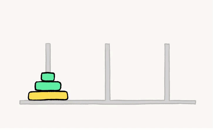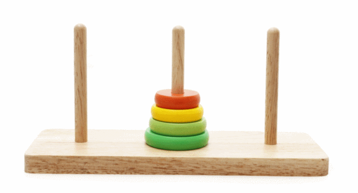 大梵天创造世界的时候做了三根金刚石柱子,在一根柱子上从下往上按照大小顺序摞着 64 片黄金圆盘。大梵天命令婆罗门把圆盘从下面开始按大小顺序重新摆放在另一根柱子上(可以借助第三根柱子做缓冲)。并且规定,在小圆盘上不能放大圆盘,在三根柱子之间一次只能移动一个圆盘。
