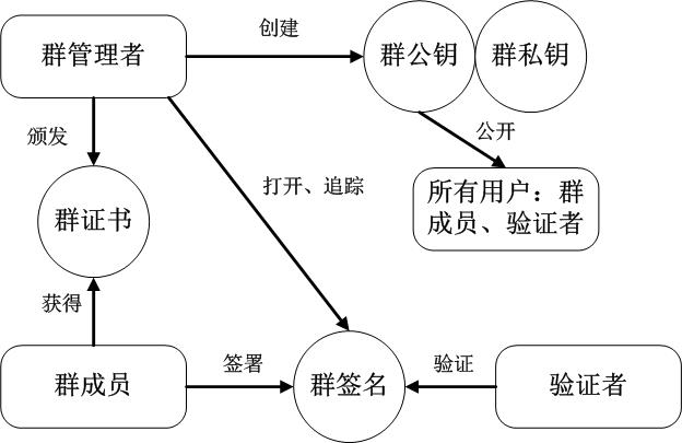 4. 验证同时验证者利用群公钥仅可以验证所得群签名的正确性,但不能确定群中的正式签署者。
