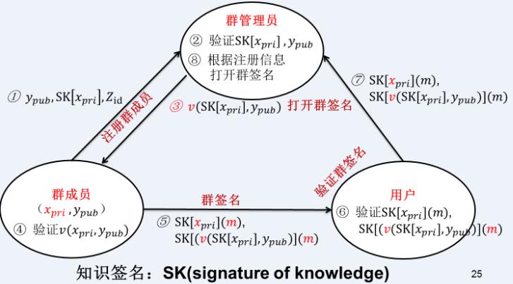 ii. z = g^y3. Alice发送y、z和自己对z的个人签名给群管理员GM,并使用知识签名证明自己知道满足y=a^x(mod n)的x