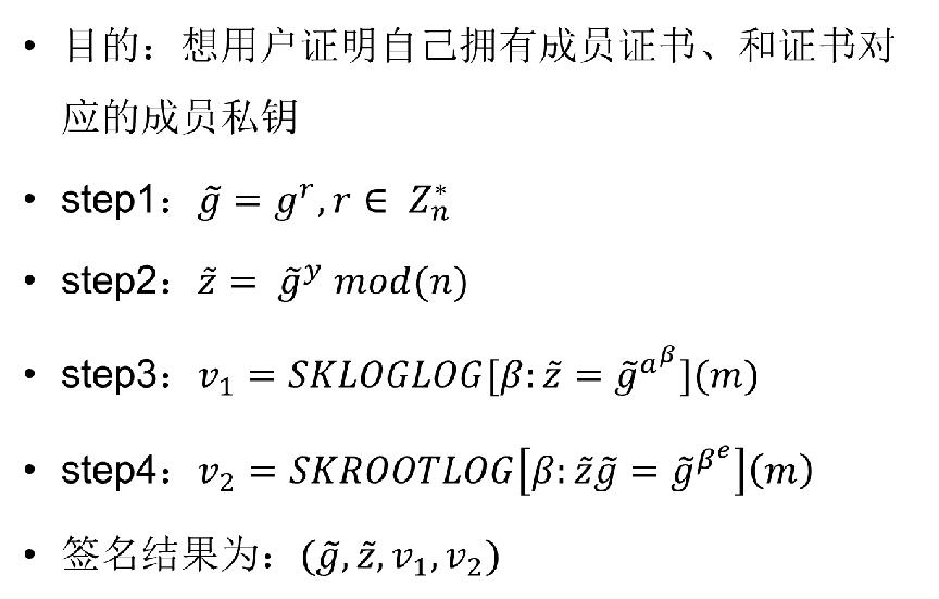 验证群签名只需用到 双离散对数的知识签名(skloglog),和离散对数的e次方根的知识签名 (skrootlog) 就可以了。打开群签名