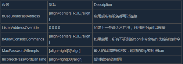 可以通过修改Game.ini或通过服务器的命令行来启用Rcon。 要通过命令行启用它,您可以用参数-Rcon -RconPassword = password -RconListenPort = 27015用您的选项替换密码和端口。
