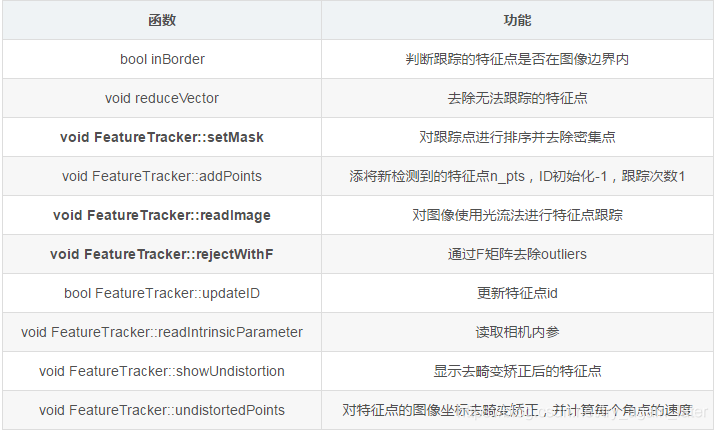 ROS的回调函数,主要功能包括:readImage()函数对新来的图像使用光流法进行特征点跟踪,并将追踪的特征点封装成feature_points发布到pub_img的话题下,将图像封装成ptr发布在pub_match下。