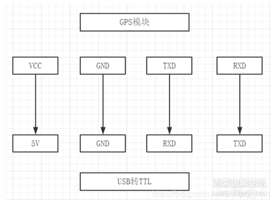 1.2.转换器和gps模块连线方法如下图(只需要连四根线,图是盗来的),串口针脚处有字母标记,不要连错了: