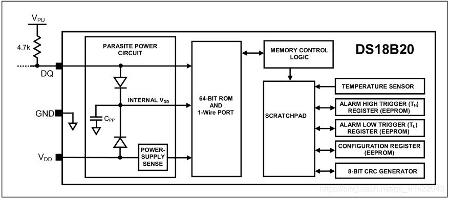 DS18B20内部主要包括,64位ROM、2字节温度输出寄存器、1字节上下警报寄存器(TH和TL)和1字节配置寄存器。ROM中的64位序列号是出厂前被光刻好的,它可以看作是该DS18B20的地址序列码,每个DS18B20的64位序列号均不相同,这样就可以实现一根总线挂接多个DS18B20的目的。配置寄存器允许用户将温度 - 数字转换的分辨率设置为9,10,11或12位。DS18B20控制引脚需要一个上拉电阻,并通过开漏模式连接到总线。DS18B20无需外部电源也可运行,当总线为高电平时,通过DQ引脚提高电源,并将电存储在Cpp电容中,在总线处于低电平时为器件供电,这种方法称为“寄生电源”。另外DS18B20也可通过VDD供电。结构图如下: