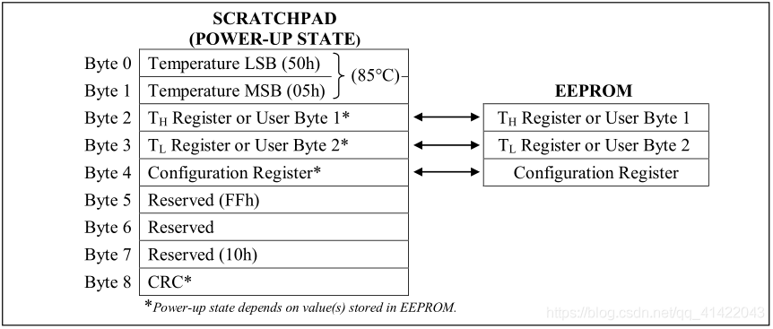 高速暂存存储器由9个字节组成,分为温度的低八位数据0、温度的高8位数据1、高温阈值2、低温阈值3、配置寄存器4、保留5、保留6、保留7和CRC校验8。器件断电时,EEPROM寄存器中的数据保留,上电后,EEPROM数据被重新加载到相应的寄存器位置,也可以使用命令随时将数据从EEPROM重新加载到暂存器中。