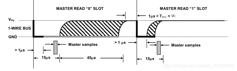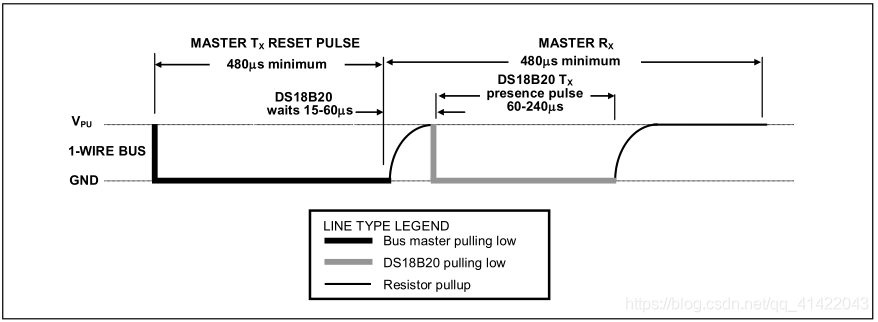 主机首先发出一个最少480微秒的低电平脉冲,然后释放总线变为高电平,并在随后的480微秒时间内对总线进行检测,如果有低电平出现说明总线上有器件已做出应答。若无低电平出现一直都是高电平说明总线上无器件应答。