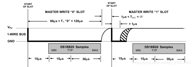 写周期最少为60微秒,最长不超过120微秒。若主机想写0,则把总线拉低电平最少60微秒直至写周期结束。若主机想写1,则一开始主机先把总线拉低1微秒表示写周期开始,1微秒后就释放总线为高电平,一直到写周期结束。做为从机的DS18B20则在检测到总线被拉底后等待15微秒然后从15us到45us开始对总线采样,在采样期内总线为高电平则为1,若采样期内总线为低电平则为0。