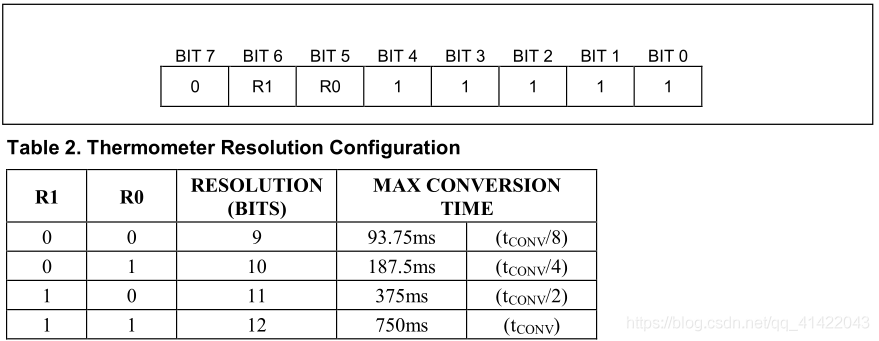 在配置寄存器中,我们可以通过R0和R1设置DS18B20的转换分辨率,DS18B20在上电后默认R0=1和R1=1(12分辨率),寄存器中的第7位和第0位到4位保留给设备内部使用。