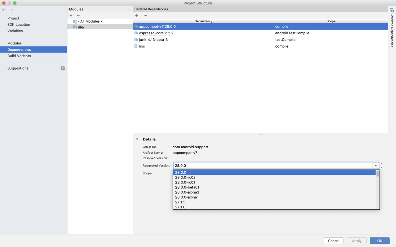 直接点击下面的错误提示(Failed to resolve:com.android.support:appcompat-v7:28.0.0),在右边点maven...(蓝色字体,记不清楚具体内容了,反正有个maven什么的),最后点击下方的“Do Refactor”,重新运行,编译成功!