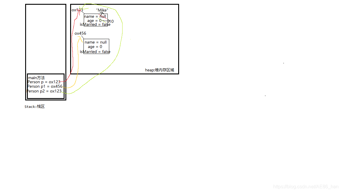(5)赋值操作,从右向左进行,将引用p中存放的对象的首地址赋给Person类型的变量p2,那么p2和p就同时存放相同的首地址值,那么两变量都指向堆内存中的同一个对象实例