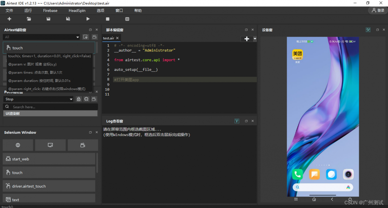 点击“touch”,点击完成后,在设备区域当中,如果鼠标的形状变成“十”字型的形状,代表已经可以了,此刻可以截取美团APP(类似于截图一样)