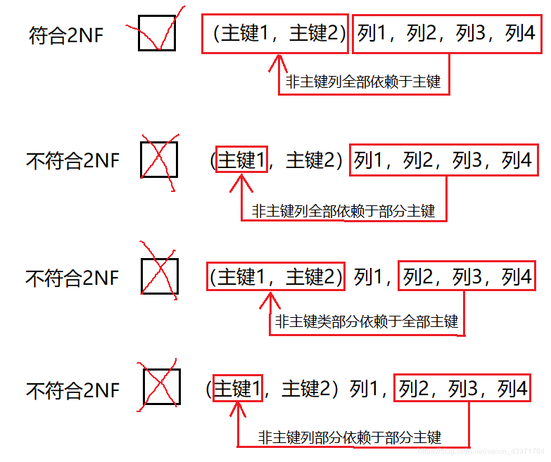 定义听起来有点绕,不慌,直接看图,只有全部的非主键列依赖于全部主键,才满足第二范式。