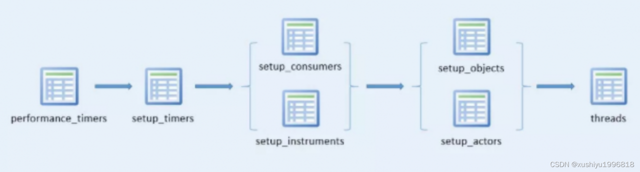 7、收集的事件数据存储在performance_schema数据库的表中。这些表可以使用SELECT语句查询,也可以使用SQL语句更新performance_schema数据库中的表记录(如动态修改performance_schema的setup_*开头的几个配置表,但要注意:配置表的更改会立即生效,这会影响数据收集)