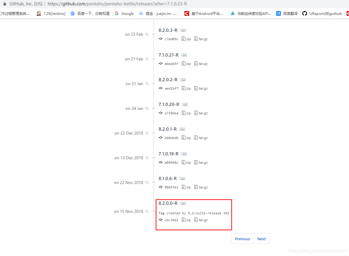 1、下载kettle8.2的发布版源码包,具体版本为8.2,地址:https://github.com/pentaho/pentaho-kettle/releases?after=7.1.0.23-R。具体位置如下图