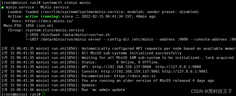 [root@minio1 run]# systemctl daemon-reload [root@minio1 run]# systemctl enable minio && systemctl start minio [root@minio1 run]# systemctl status minio