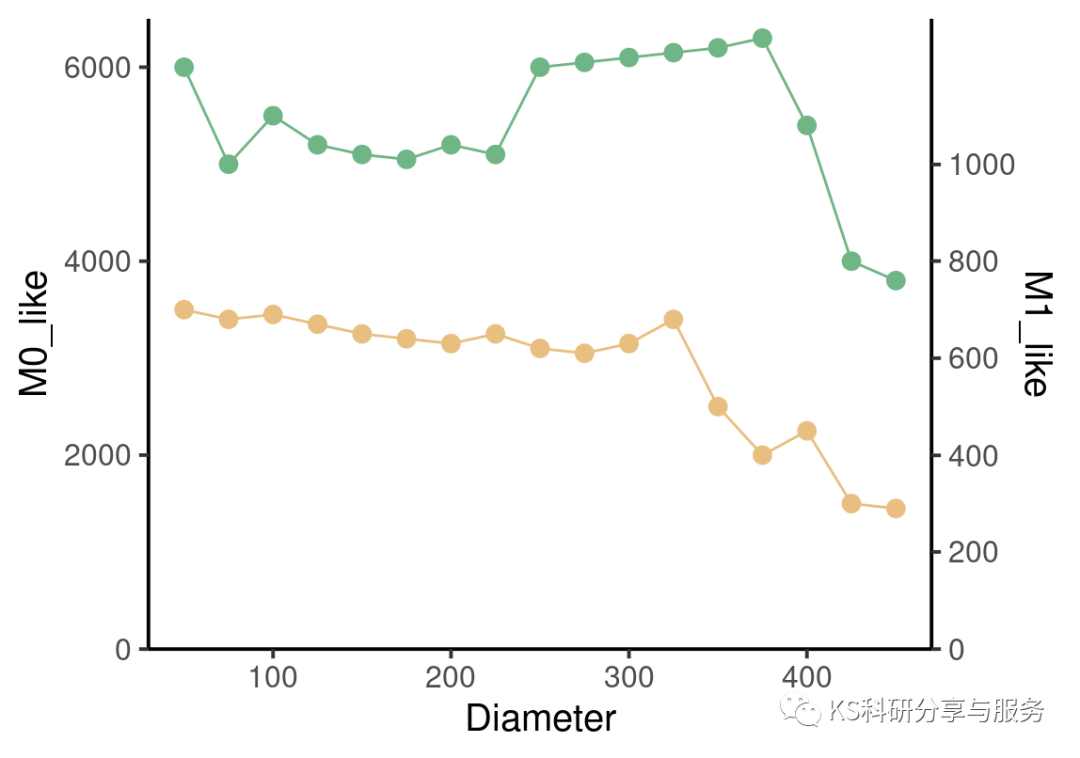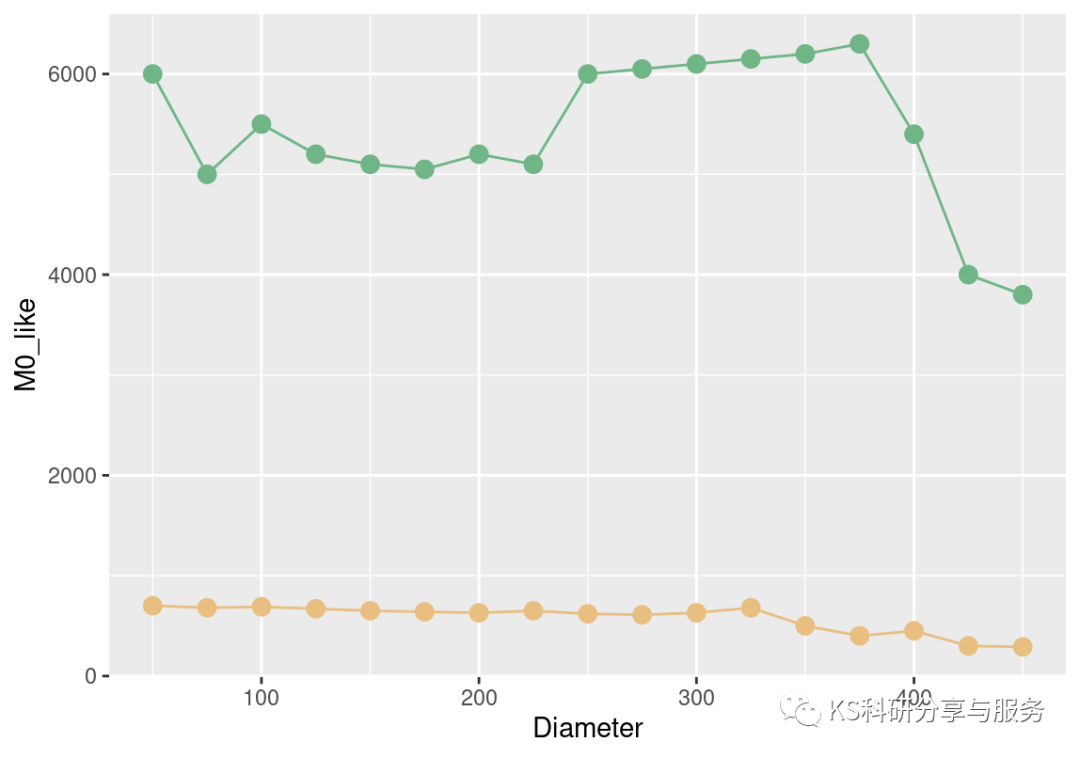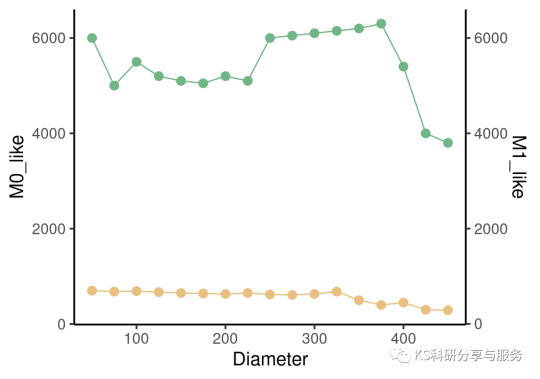 geom_point(aes(y=`M1_like`*5, x=Diameter),size=3,color="#E8BF80")+