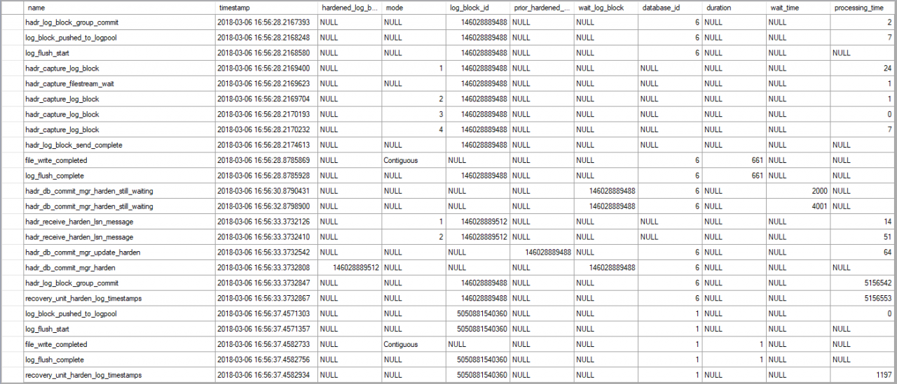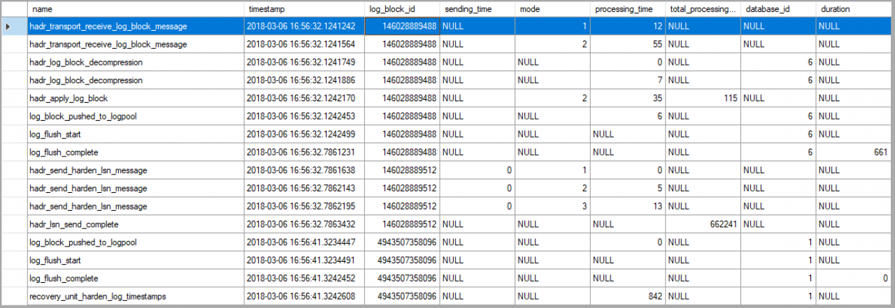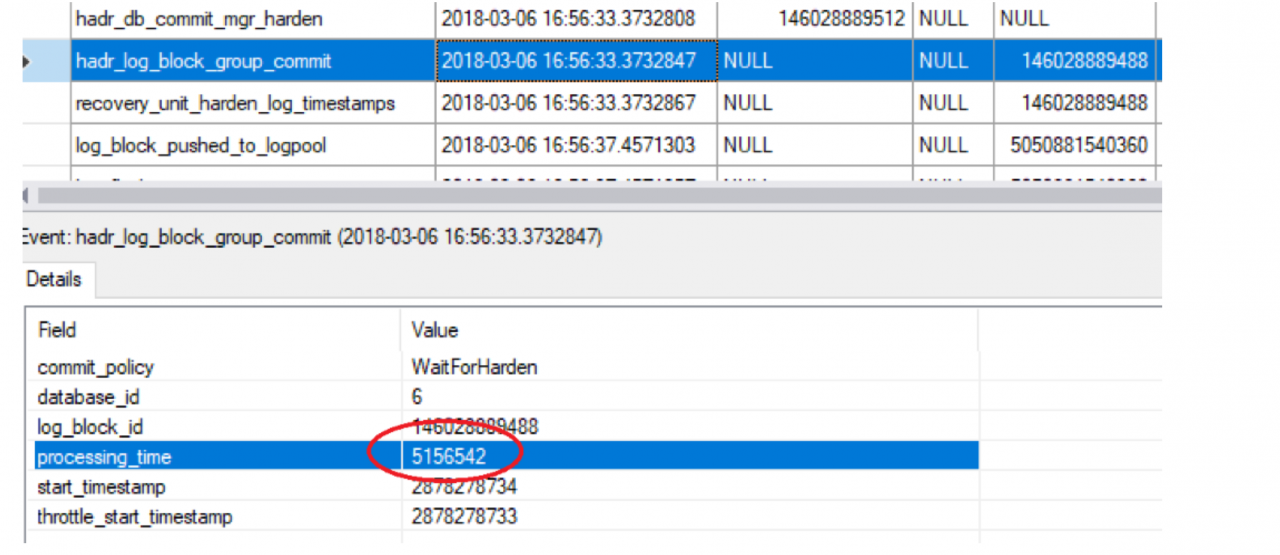 | Network: Primary->Second | Primary: hadr_log_block_send_complete 2018-03-06 16:56:28.2174613 | Secondary: hadr_transport_receive_log_block_message 2018-03-06 16:56:32.1241242 | 3.907 seconds |