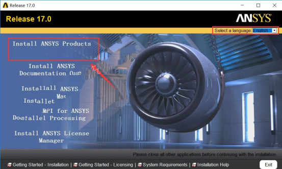 5.语言选择【English】,然后点击【Install ANSYS Products】。