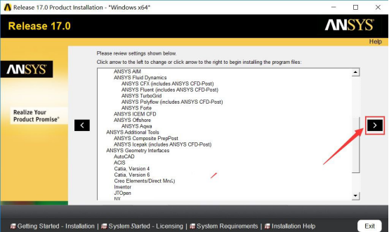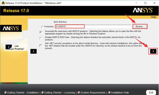 7.点击【Browse】更改软件的安装路径,建议安装在除C盘之外的其他磁盘,可以在D盘或其他盘新建一个【ANSYS】文件夹,然后点击【>】。