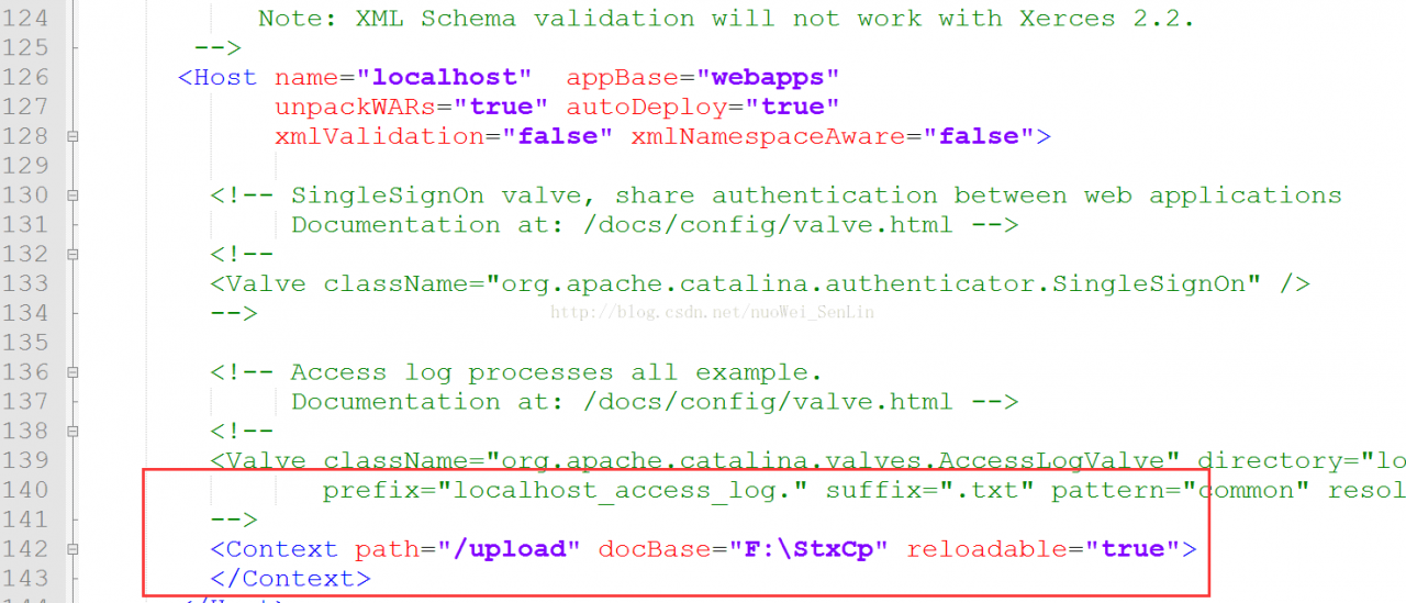 <Context path="/upload" docBase="F:\picturedir\" reloadable="true"></Context>